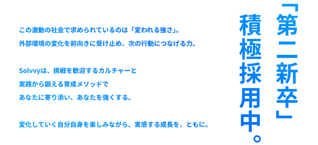 Solvvy株式会社では、「変われる強さを、育む会社。」というテーマのもと、新たなキャリアに挑戦したい第二新卒の方を積極的に募集しています。