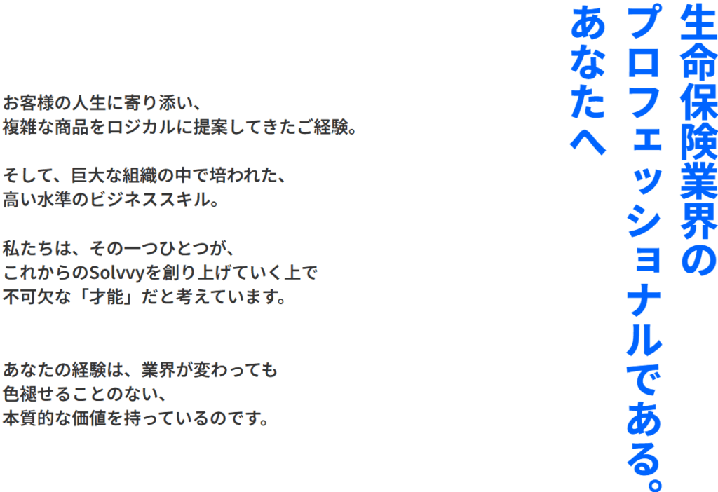 Solvvy株式会社では現在、生命保険業界で培われた豊富なご経験と専門性を持つ方々を対象としたキャリア採用を強化しています。