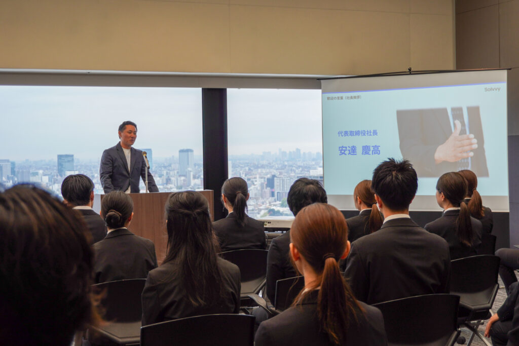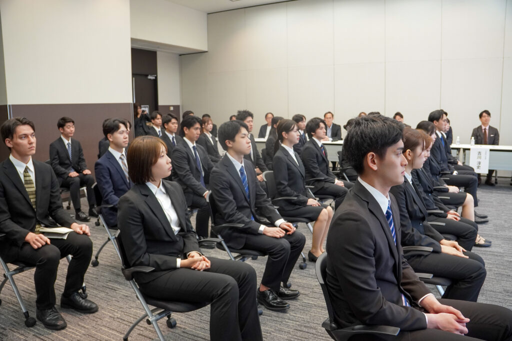 式典では、代表取締役社長の安達慶高をはじめとする役員より、新入社員の皆さんへお祝いと激励の言葉が送られました。当社のタグライン「変われる強さを、育む会社。」に触れ、変化を楽しみながら自らを変容させていくことへの期待、そして未来を共に創る仲間として心から歓迎する気持ちが伝えられました。